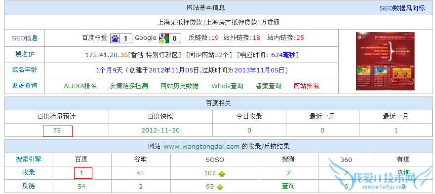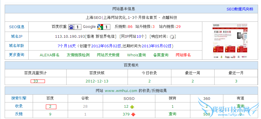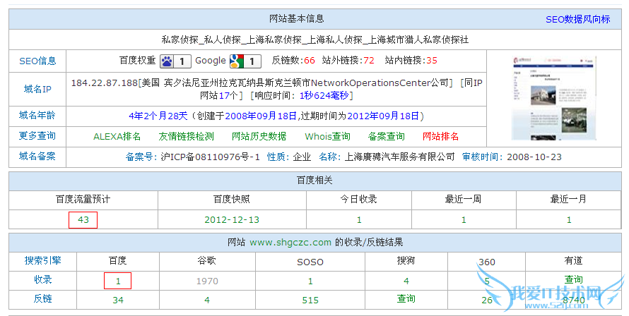 上图中最后一个网站就是,我们来看看这个网站的基本信息以及网站的收录和反连,如下图: