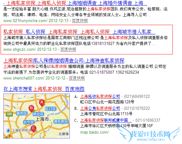 下面我又在百度中搜索“上海私家侦探”,我在首页发现了一个网站和上面的网站是一样的,具体看图: