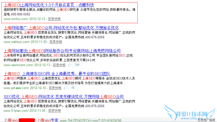 上面提到的几个网站应该都算是百度所打击比较严格的行业网站,下面就来看看正规的行业的关键词,我在百度中搜索“上海SEO”这个关键词,在首页发现一个网站,如下图:
