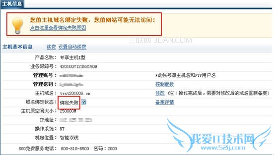 2、在主机信息中可以查看“域名绑定状态”,如果显示绑定失败,请您点击“点击这里查看失败原因”,系统会自动判断您的主机域名是否已经备案成功,如果已经备案成功则会自动为您绑定域名。