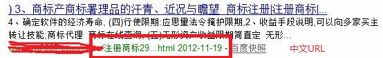 特征三总结:百度可以读取URL前面的词语。图九描文本为:什么是同类同一商标计策。图十跟图十一的描文本均为来源于(注册商标网感觉是因为URL之前的词语是以结束符号,