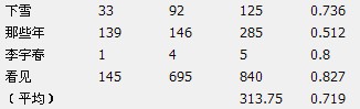 下雪(0.736 × 125 + 0.719 × 313.75) / (125 + 313.75) ≈ 0.724