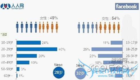 下图是人人网与FACEBOOK的用户年龄结构对比,可见人人网是更具有年轻的血液的。