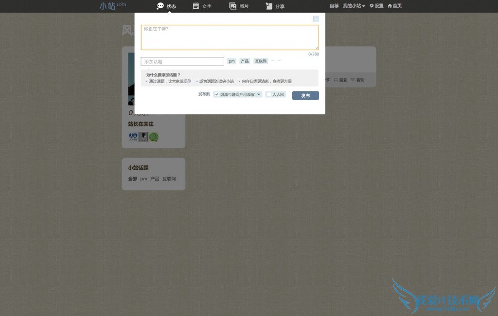 体验设计上人人小站和点点网最佳,人人小站尽管功能不多,但设计较为精细,“状态、文字、照片、分享”四个按钮没有像其他轻博客一样做成较大的图标,而是将四个简约线条风格的小号图标放在精简的导航条上,点击图标后也是弹出内容输入框,而不是进行页面跳转。(除了这四个按钮,人人小站在评论、转载时也进行了 如此的弹出浮动框处理)