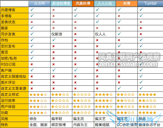 随着人人小站上线,国内大型互联网公司又增添了一款轻博客产品。在第二期的《风真互联网产品观察》中会对这些轻博客产品做一个详细横向对比分析,这里先提供一个简单的对应表。评价系统并不科学,基本是主观感受,但应该能给一些读者提供一个大概的概念了。网易Lofter、QQ空间6.0因为内测资格的问题还没有看到,希望今后也能补充进来吧。