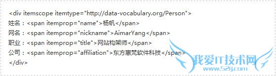 以上例子中,第一行中的 itemscope 表示大类,div 中所含的内容描述了某一项(有人物、商品、地址、活动、事件等等),而 http://data-***.org/Person 则定义该项是人物(第二个案例中我们定义了商品)。