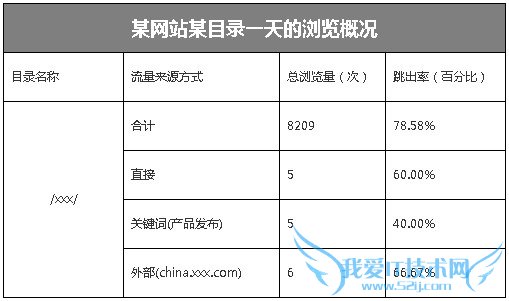 通过这个表格所列出的数据,我们可以得到三个数据。就是被浏览的目录是/xxx/,目录/xxx/被浏览了8209次,8209次中的跳出率是 78.58%。这个比例已经非常大了!我们可以算算,总共浏览是8209次,跳出是8209的78.58%,也就是8209×0.7858≈6451 次,8209次浏览跳出了6451次,那么8209-6451=1758。总访问是8209,但是真正到达该目录首页后继续深入浏览的只有1758次浏览,这代表什么?这代表还有6451次几乎是流失的浏览量!什么叫流失?你可以把它当成浪费,你也可以把他当成有上升空间,你也可以……总之!这部分流失的浏览量你应该可以把它控制的更小,更少。