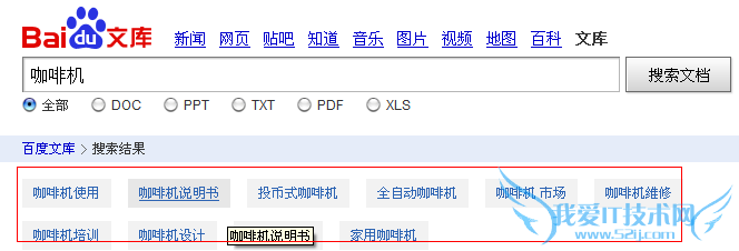 在对网站内容进行建设时首先得明确网站的主题,在明确网站主题时就可以通过网络或阅读相关行业的杂志书刊查找与网站主题相关的文章进行阅读,在阅读过程中要用心去捕捉灵感抓住文章中的某一句话来进行展开对软文的撰写或者看完一篇文章后用自己的话写出你对该文章的一些感想或总结等在撰写中很自然的融入所要优化的关键字保持与整篇文章通顺,这样的软文就是一篇很不错的文章。比如笔者的网站主要是销售咖啡机的那么笔者就会通过百度、搜搜、360或搜狗等去搜索 “咖啡机”这个词找出与咖啡机相关的文章阅读,如笔者在百度文库搜“咖啡机”这个词就可以找到很多与咖啡机相关的文章如下图1所示: