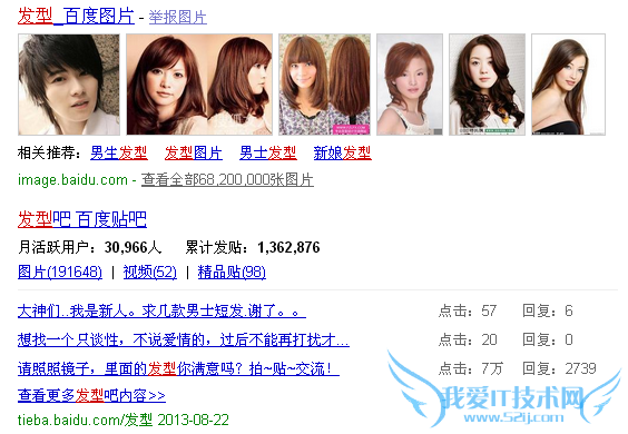搜索结果中百度的图片和贴吧出现在了前面的位置,因为对于发型这个词用户有讨论和图片的需求,用户想要让别人认可自己的发型或者想看看自己的发型到底适不适合自己他需要一个交流的地方,这一点看里面的帖子就能知道,同时用户也需要图片想看看哪些发型是自己喜欢的。