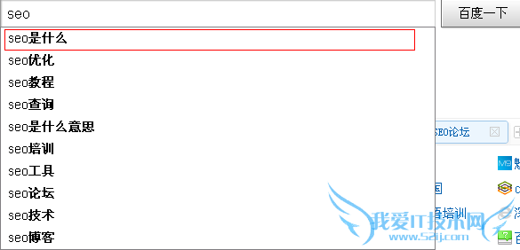 搜索SEO这个关键词我们能从百度下来框看出用户这一段的最大需求是SEO是什么,这时候百度百科就会排在第一位。