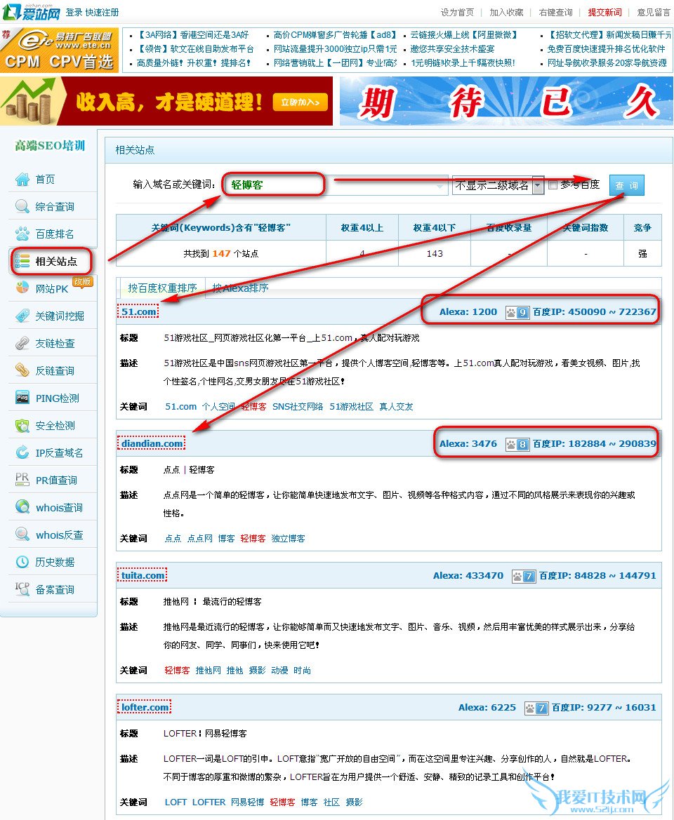 平时本人喜好用爱站,功能强悍,其中的相关站点就是我们可以利用的一个非常不错的工具,可以根据你搜素的关键字搜素出相关站点,这些站点爱站工具会根据快照,权重的高低进行排序,一般我们会选择权重4或者5的站点进行信息发布。