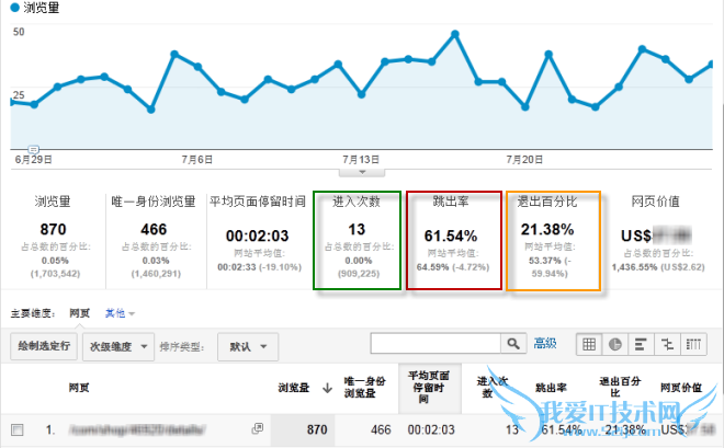 跳出率只适用于访问着陆页面,可以看到此页面作为访问着陆页面共带来13次访问。 13的62%约等于8,即只是870次浏览量中该页面的跳出次数为8 。