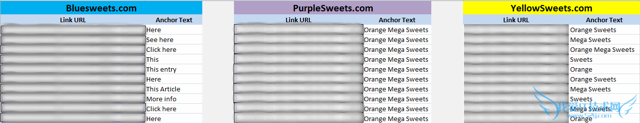 yellowsweets.com的链接锚文本为多个不同的单词,但是每个单词都跟要优化的主关键词“Orange Mega Sweets”相关,差不多是“Orange Mega Sweets”拆解的词。