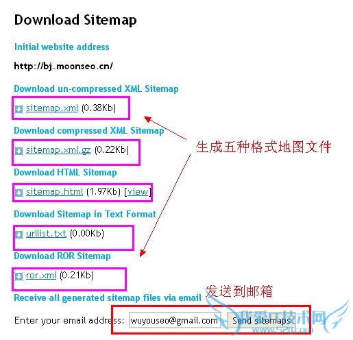 一般等待3-4分钟左右,就会生成五种不同格式网站地图,如下图所示: