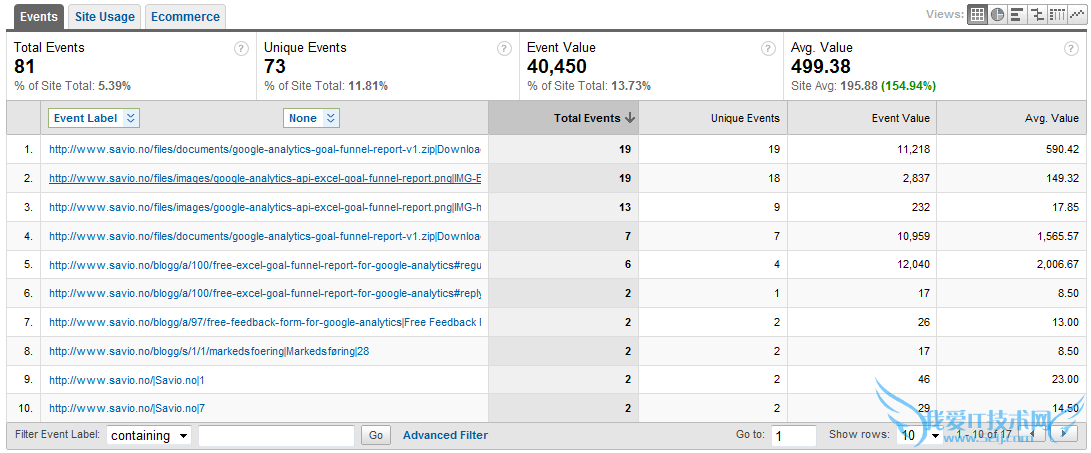 2. 帮助我们为具有相同URL的不同链接做好记号。有两种方法。第一种方法,就是在相同URL的后面,加上不同的参数。例如,有两个链接都链接到:http://www.chinawebanalytics.cn/about_author/,技术同事可以帮我们改为:http: //www.chinawebanalytics.cn/about_author/?from=navbar和http: //www.chinawebanalytics.cn/about_author/?from=footage,以表明一个是在导航栏中的链接,一个是在底部的链接,尽管它们链接地址都是http://www.chinawebanalytics.cn/about_author/,但Google Analytics还是会记录两个不同的页面。第二种方法看起来先进一些,是一个老外提出的方法,他编写了一段程序,你只需要定制一下,然后放在页面中就可以了。一旦这个程序正常运转,GA在捕获这些具有相同URL的链接时,就会把数据放入Events报告中,并且自动加一个尾巴。如下面的图所示(点击看大图):