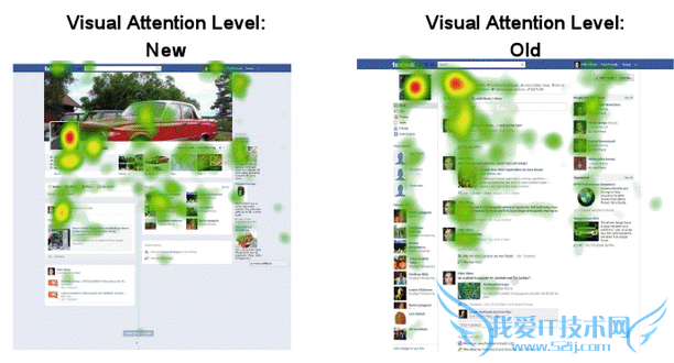 下面这张图是Facebook改版前后的用户注意力热图。一言两语似乎没法表述这次改版到底是成功还是失败,但在某一个方面,Facebook很成功的让用户的注意力产生了“左右对称”,而摆脱了“Google页面的浏览模式”。