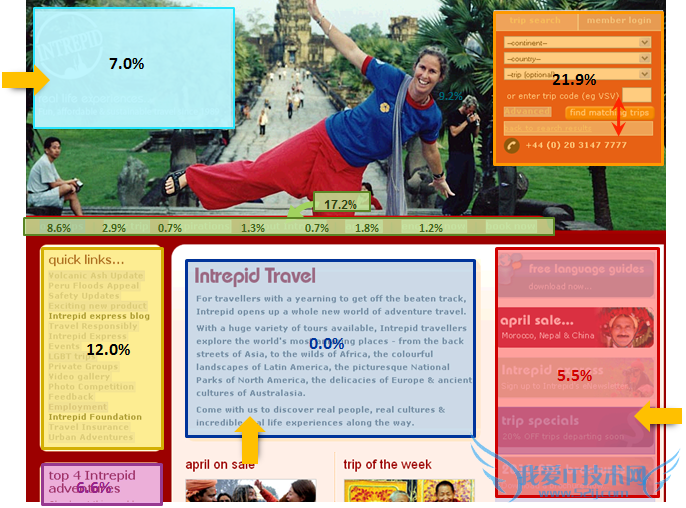 我们拿点击热图衡量用户的兴趣,这很恰当,点击多的表明用户兴趣大。但反过来则不一定成立,即点击少的地方不一定用户的兴趣就少,或者说,人们的注意力被吸引的程度和鼠标点击的次数并不总是保持一致的。道理很简单,人们眼光注意到的地方未必是能够被点击的区域,或者虽然对用户产生了吸引力让人情不自禁地多看了两眼,却缺乏足够的说服力让用户点击链接(请注意有吸引力的东西未必就有说服力);反过来,在另外一些地方,也许一开始用户根本就没有给予更多的注意,但部分用户多看两眼后发现了它并且认可这个区域的价值,因此这里也许能获得了不少的点击,但却不是注意力的焦点。因此,点击热图肯定不能完全用来描述页面吸引人们注意力的情况,也不能完全满足我们在设计页面时的一个重要需求,即让页面中最能抓住人们注意力的地方放入最为重要的内容,从而保证用户注意力和兴趣的一致性。