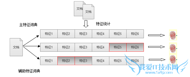 上图演示中有两个辅助特征词典,主特征词典抛弃了特征5和特征6形成辅助特征词典1,主特征词典抛弃了特征2和特征3形成了辅助特征词典2。并且根据三个特征词典分别形成了文本指纹。如果两篇文档有两个指纹信息相同那么即可判定两篇文档重复。