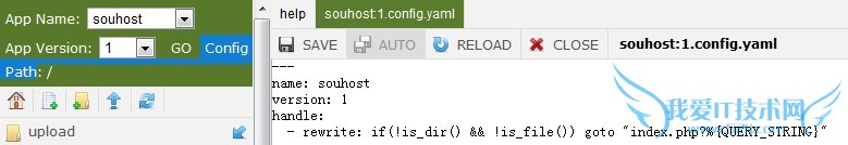 进入新的页面后,我们会看到,左上角有一个“Config Path”,SAE就是通过设置它来实现伪静态的。点击它,在右侧会显示它的编辑页面,在里面加入如下代码。