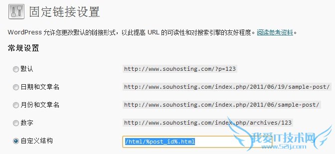最后将wordpress里的固定链接格式设置成如下格式“/html/%post_id%.html”,这个可以根据个人喜好进行调整。