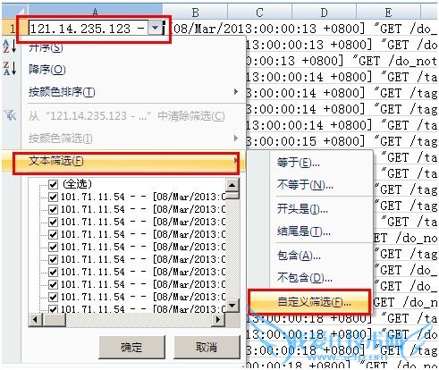 点击IP段下拉框,找到文本筛选,选择自定义筛选。