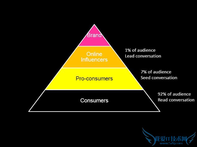 观看者:指的是信息的消费人,他们一般观看博客文章,在线视频,论坛,论坛的留言回复。做个观看者门槛很低,不像创造者或者评论者那样要奉献许多内容,所以这个队伍更庞大。