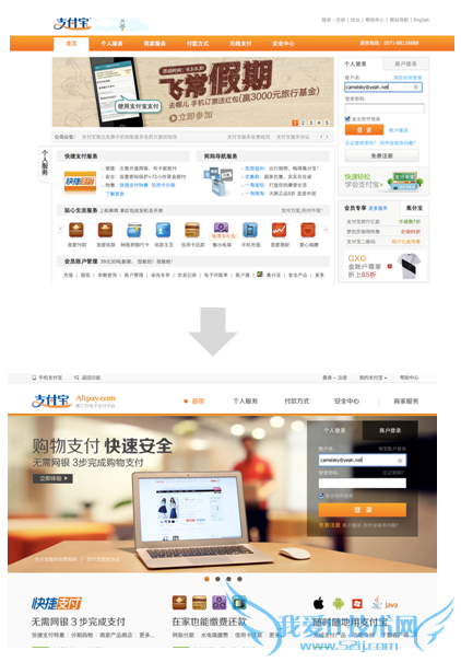 支付宝近期在测试新版首页,我们来到支付宝首页最常进行的操作就是登录,而老版首页视觉第一焦点是导航及活动推广位,导航只要在固定的位置,用户在需要时能找到就已经达到目的了,它不应该成为页面的视觉焦点,除非用户经常在导航进行切换以了解网站提供的服务,在这点上新版首页弱化了导航及其他应用入口,强化支付宝本身的品牌传达及登录行为,很符合主流用户的行为习惯