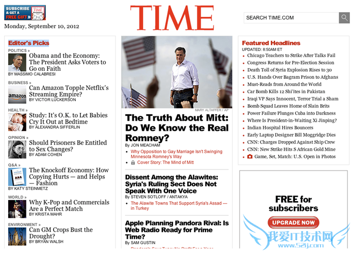 我们看新闻时首先要关注的当天的头条新闻,其次是编辑推荐的,时代周刊首页很好的让头条新闻和logo一起第一眼被我们捕捉到,主次处理的很清晰