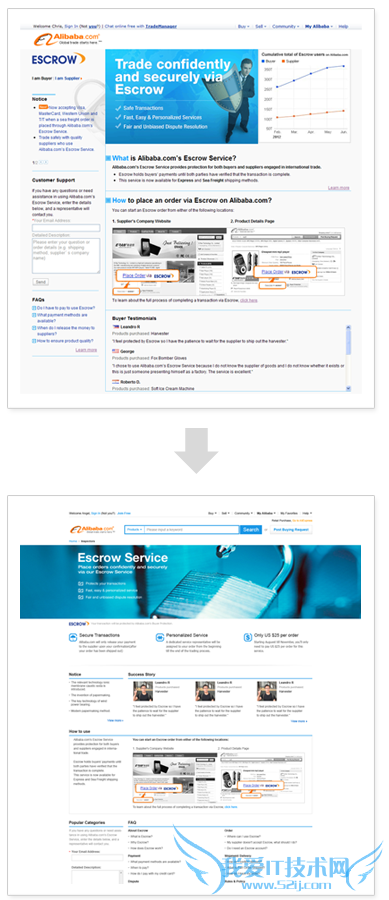 上图我们团队对alibaba.com提供的服务介绍页面进行改版的项目,改版前的设计层级区分不明显,使得用户进入该页面时不能快速了解服务的概况,来判断是否继续深入了解;而改版后通过大小的对比,呈现抓住用户第一眼印象的信息,初步判断符合自己的需求,用户才会继续浏览。