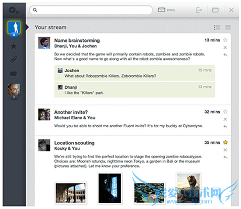 Fluent新型电子邮件界面,箭头指向、缩进的表现形式很清晰的表达信息的包含关系,虽然这个创业团队没有成功,但产品的设计还是很值得借鉴的