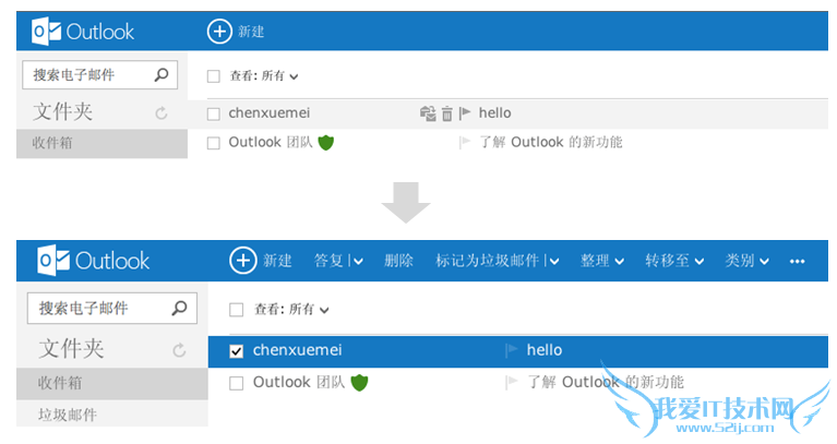Outlook邮件网页界面,默认情况下对邮件的操作入口都是隐藏的,只有当用户选择了邮件之后,才会出现对邮件的操作,同时不常用的操作也会被隐藏到下拉菜单中,如“答复”菜单下隐藏的“全部答复、转发”,这种隐藏非核心内容的处理方式,能让用户更集中于他可关注的信息和主要操作
