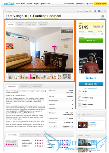 上图是Airbnb的租房信息detail页面,租客在租房时最关心的信息为:房间实景、价格、房东的信息;看它的detail信息,也存在很多种类型,但用户最关心的三类信息因为位置、占用的面积大小让租客一眼就能掌握房子的基本信息,如有兴趣再继续看更多详情。