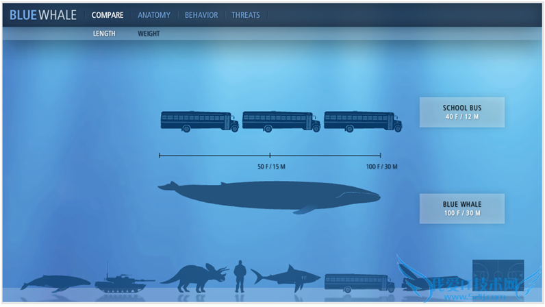 举个例子:国家地理蓝鲸网站 为了呼吁保护蓝鲸,首先要让人们了解蓝鲸的特征及当前的威胁,网站通过动态的将蓝鲸与其他生物和人造物进行对比,形象直观的传达蓝鲸的重量、大小,加上视频展示目前蓝鲸的主要生活威胁,用户即使不阅读文字也能大致明白网站想要传达的信息