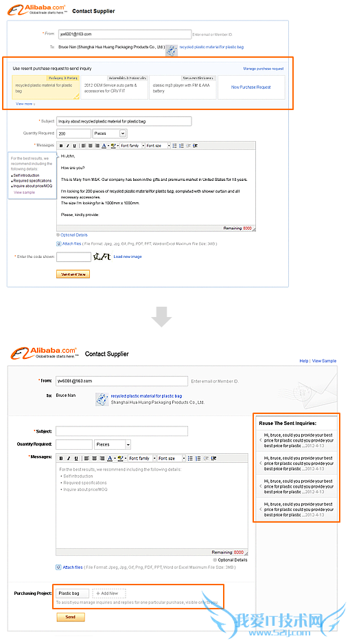 下面左图框出部分是增加的功能,希望买家在发询盘给供应商时能对当前的采购需求建组并复用上次的内容,在内部讨论时,大家都觉得要强化该选项,让它成为其他内容的统领,然而调研的结果却大相径庭,用户无法理解这块内容或干脆以为是贴的广告内容而忽略;