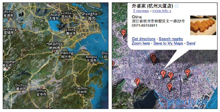 左地图是市级展示的地名,当用户搜索到街道级别时,才会把本街区内的店铺展示给用户,在特定的情况下只展示必要的信息,有利于用户高效找到自己的目标