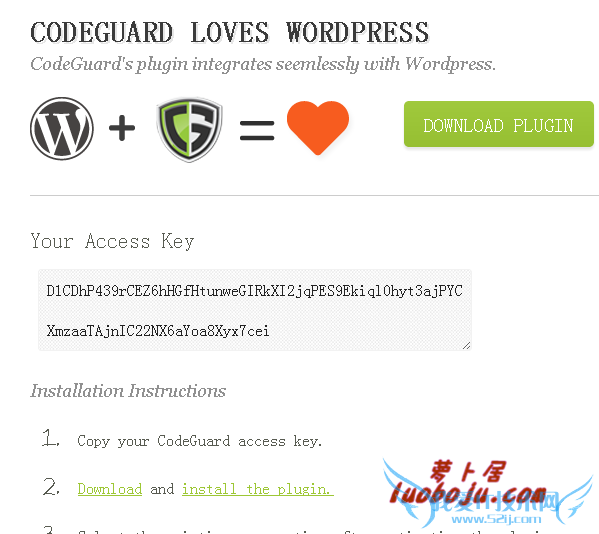5、下载wordpress插件,并安装在自己的wordpress网站上安装该插件。注意其 access key,将其复制下来,安装wp插件的时候需要使用。