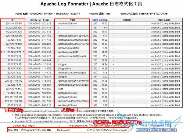 将原始访问日志导入到日志格式工具中,在这里推荐使用在线的日志格式化工具(http://xiaoxia.de/upload/apache- log-formatter.html),格式化工具将提供详尽的来路ip、受访页面、User-Agent等信息,通过这些基础信息,我们可以找到蜘蛛来路ip和页面的对应关系。