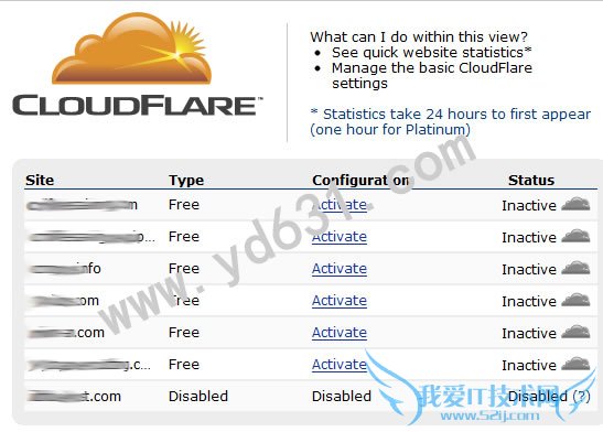 第三步,激活开通之后,在右侧列表中会看到我们所有在BLUEHOST主机中的域名站点,然后可以根据你自己的需要激活需要加速的站点。