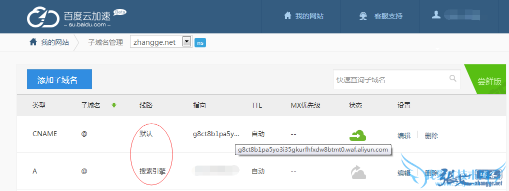 那该如何解决这个问题呢?想必看过张戈博客上一篇文章的朋友已经了然于心了吧?没错!和备案不影响SEO的做法一样:将默认线路cname到阿里云WAF地址,然后再新增一条搜索引擎线路,指定到源服务器IP即可!这样就可以长期开启云盾WAF防御,而不影响SEO了!