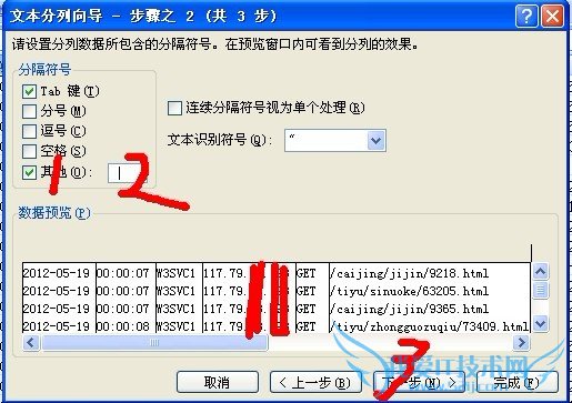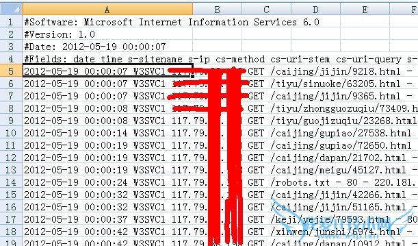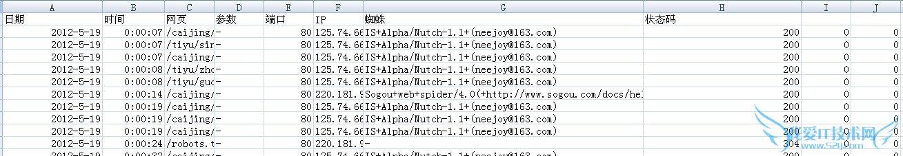 然后选择A1列>右键>插入 然后将C,D,E,I列删除。在第一行分别输入:日期,时间,网页,参数,端口,IP,蜘蛛,状态码 另外说明一下参数,参数这个是动态网页面问号(?)后面的部分。http://www.***.org/jiaju/chufang /5309_3.html 这个路径后面的参数值为3,那么组合之后真是的URL就是http://www.***.org/jiaju/chufang /5309_3.html?3 因此说明蜘蛛还是可以分辨参数的,有些网站投放广告后面经常都会带上参数进行统计,但经过抓取后参数都会被去除的。所以尽量不要在内容页使用此类的 URL。
