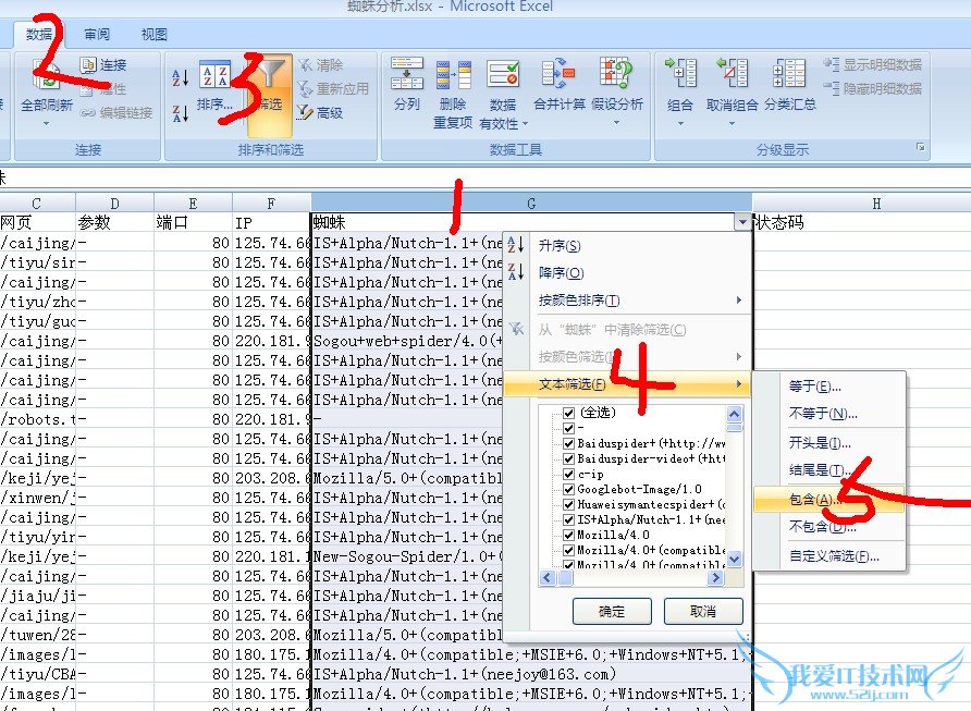 输入baidupider 点击确定。即可看到所有百度蜘蛛访问的数据,这样的话大致的数据已经呈现出来了,如果查看google在筛选时候输入googlebot就可以了。随后制作一个简单的数据透视表便于分析。 一次顺序:插入>数据透视表>数据透视表>确定 在右侧按先后顺序勾选网页,蜘蛛,时间。然后点击蜘蛛后面的小三角,