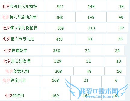 除开七夕节的日期,那么还有这些合适的关键字我们可以进行选择,在七夕节这一天,从上图中,可以看到,七夕节的礼物,七夕的祝福,七夕短信,七夕的诗句,这些都是七夕可以看得到的要点,将这些关键字作为要素来添加到自己的专题中往往会起到事半功倍的效果;但是不能盲目添加,因为我们选择出这些关键字之后,只求缘分,不求绝对,将这些关键字放入我们的专题中,然后写入自己选择的七夕礼物,优质的七夕祝福,和短信,相信最后是完全可以打动每一个用户,记住,用缘分,用内容来做用户,而不是死缠烂打的用关键字排名,体验才是你所选择的契机。