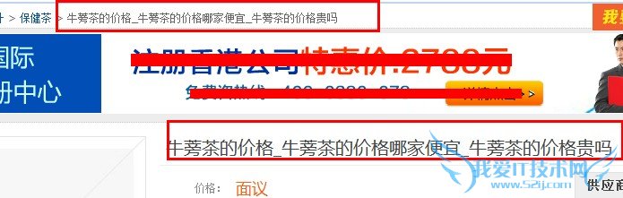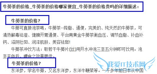 图1是标题、描述的标签,图2是位置导航和正文标题。从代码里可以看到标题“牛蒡茶的价格、牛蒡茶的价格哪家便宜、牛蒡茶的价格贵吗”、关键词标签也同上,所以不仅标题标题出现堆砌,关键词标签也出现堆砌,估计这个供应商直接把标题当作关键词一起放置了。图2是页面上显示的。如果设置好标题,位置导航还有正文上的都会显示一个,所以两者结合后会出现“牛蒡茶的价格”关键词严重堆砌,这样不仅给用户造成了不好的体验,搜索引擎也对此比较反感。