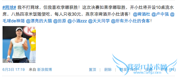 开小灶从开业对任何食客都没有折扣,对于食客不满意的菜无条件退换,严格监控食材和配料的品质,希望食客把这里当做一个家里的餐厅而不是一个饭馆。有食客建议过我们进行团购,团购只能是增加一时的热闹,但会因为低折扣伤害老客户。我们就采取了另外的一种办法,李娜网球夺冠,恰好那段时间周末中午开小灶的客流不理想,于是庆祝李娜夺冠我们就连续做了三场流水席,每个人30块每桌10个人,流水席是村长最擅长的并节约配菜的时间,从人员成本上来说并没有太多的损失。通过微博和豆瓣,每场流水席都有40多人到达,有效地增加了营业额也宣传了开小灶的菜品(李娜图)。