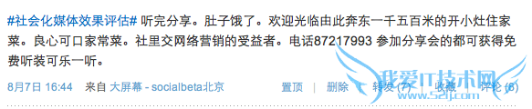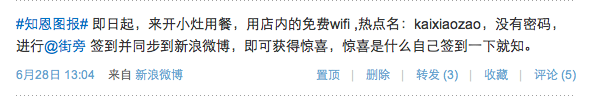 啰啰嗦嗦说了半天,第一次与大家分享一个真实的案例,希望开小灶住家菜能继续善用社交网络营销做到一个十年甚至百年老店,也希望各位研究社交网络的朋友有时间来开小灶用餐,来的时候和服务人员说是看到SocialBeta的文章来的,即可免费获赠可乐一听。关于开小灶的更多故事还请您去关注@开小灶住家菜。