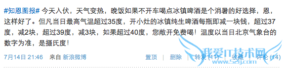 北京天气变热,学习国外的案例,我们推出了温度在35以上啤酒立减1块,39度减3块,40度以上免费,得到很多啤酒爱好者的关注。