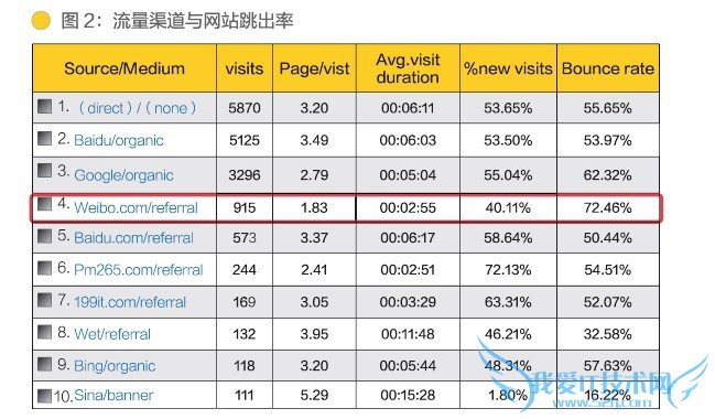 其次,流量靠不靠谱的辨识,要用对比法。通常而言,对于某一个网站,或是对于某一个重要的landing page,如果部分流量渠道bounce rate表现良好而另外一些表现不佳,我们可以认为部分渠道与网站(或landing page)有更好的匹配,而另外一些渠道则匹配不佳。例如图2的例子中,weibo.com的人群似乎不是那么喜欢这个网站。