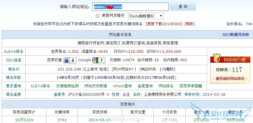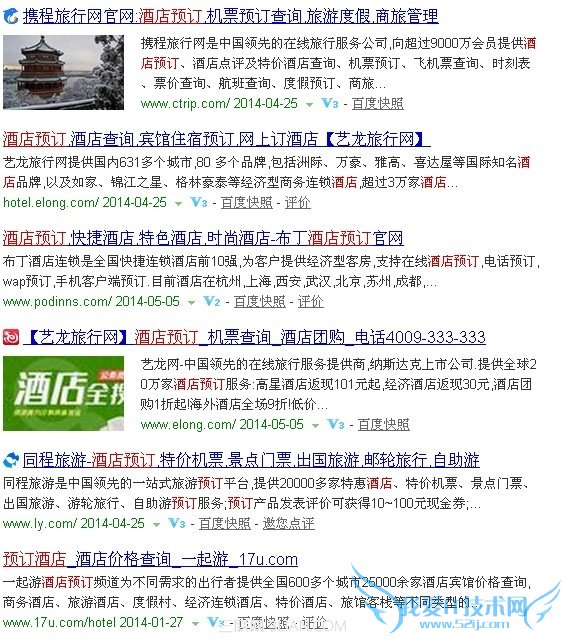 这里是百度的自然排名部分,我们从百度首页可以看到,竞价投放只有三家,去哪儿是百度的子公司,占据下面的大幅版面,右侧是品牌专区,也是可望不可及的,虽然竞争程度不是很激烈,只有三家的竞争,但我们可以从自然排名中看到首页主要的排名网站依然是这三家,我们再分析下这三家的网站情况。