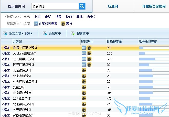 我们可以从上图看出很多问题,竞争度低,日均搜索量大的词是我们重点关注所在,去处别人的品牌词,图中北京酒店预订,北京宾馆预订的搜索量比较大,于是,我们可以确定,城市酒店预订这类词是我们的必然选择。