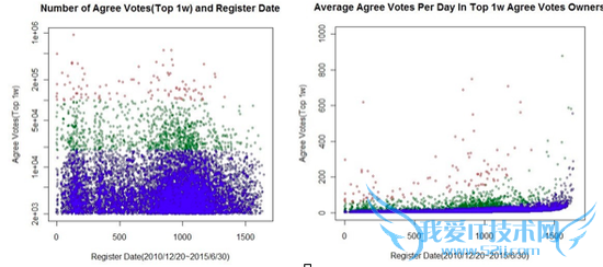 让我们一起看看以下几组数据截图,横轴为时间变化,我们截取了2010年12月20日知乎内测以来到2015年6月30日赞同数前10000的用户,根据他们的注册时间和赞同数作图,以及日均的赞数增长量。大家可以看到这些点分布的比较散,说明增长情况比较均匀。